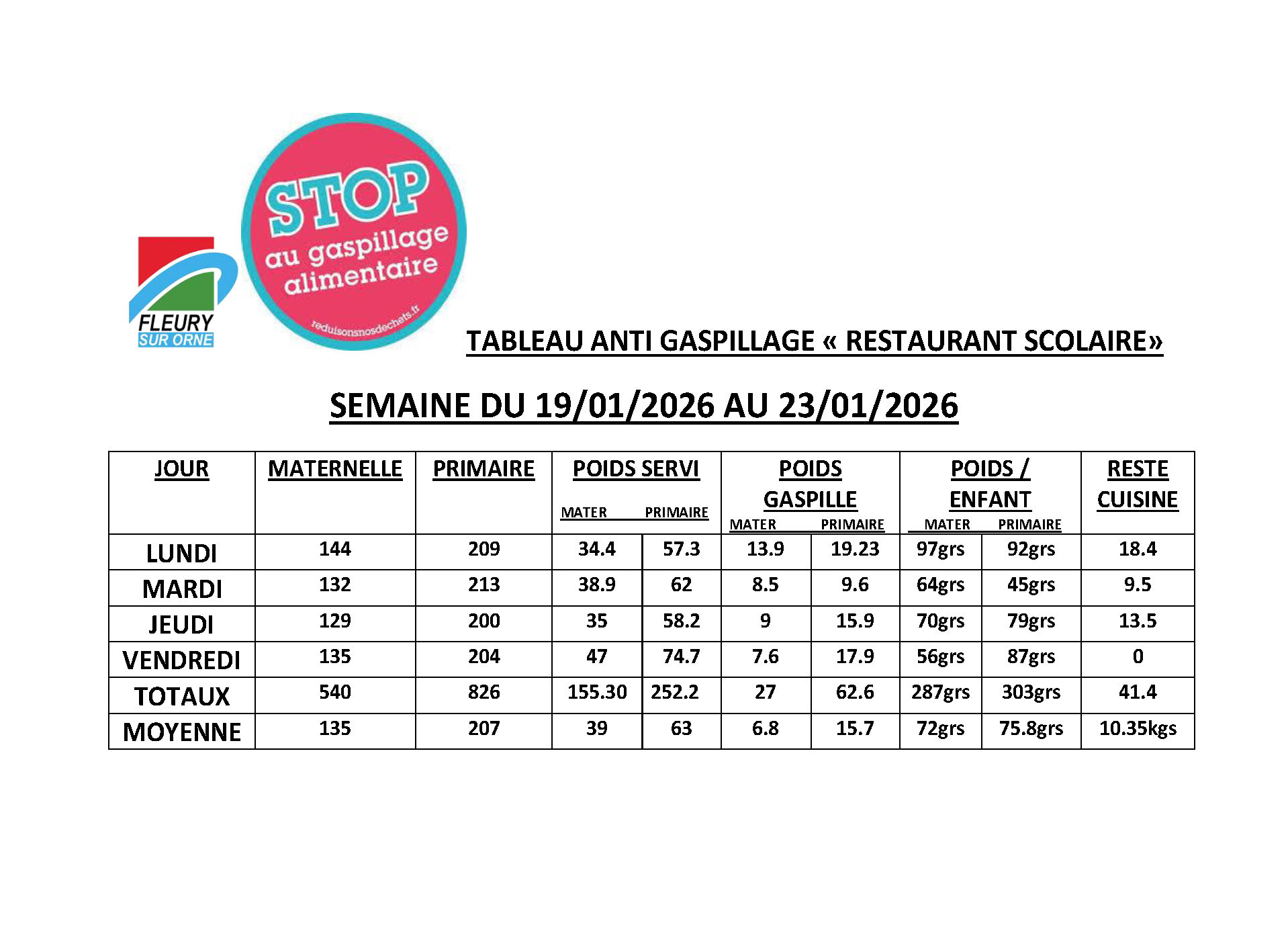 Dans le cadre de sa politique en faveur d’une restauration scolaire responsable, la Ville de Fleury-sur-Orne met en ligne le tableau de suivi de l’anti-gaspillage alimentaire pour le mois de janvier 2026.